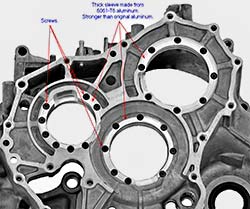 Industry innovator, Slauson Transmission Parts is at it again with it's Honda case fix that makes wobbly bearings, and shoddy sleeve jobs a thing of the past. Rather than wedging a thin sleeve around the bearing, Slauson employs a CNC machine to cut a much larger hole, and insert a thick sleeve machined from 6061-T6 Aluminum, which is stronger than the original metal. Finally these heavy duty sleeves are fastened with screws to insure that they won't move side to side or up and down. The result is a case that won't come back, the SLAUSONATOR! No need to take the chance on an inferior case creating a noisy come back on your next Honda job, and no need to accept a reman Honda unit that doesn't come with the best case available. The best Honda case on the market is priced to compete with it's flimsier cousins, starting at just $250 with a good core. |